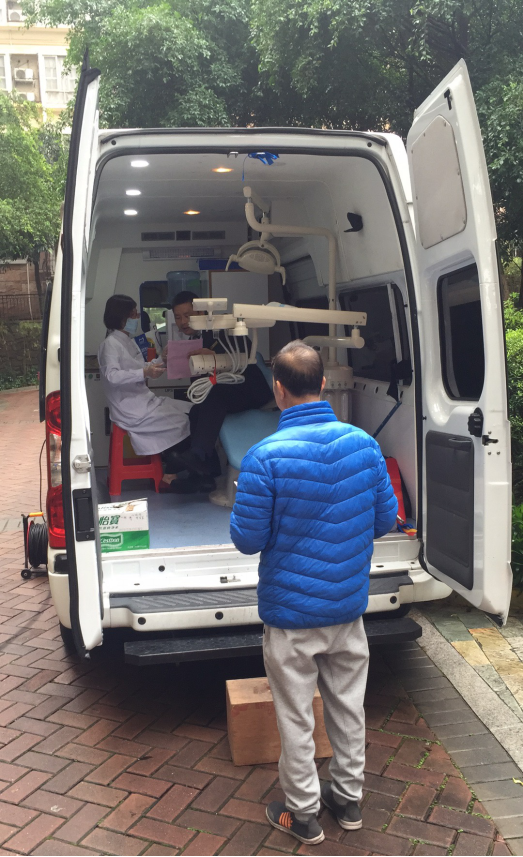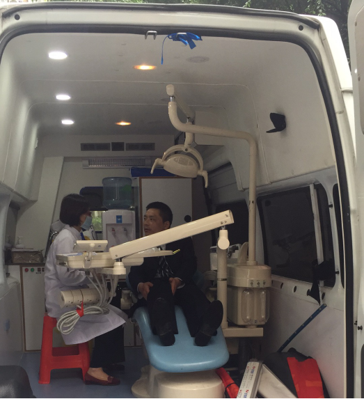 居民正在口腔检查车内检查口腔