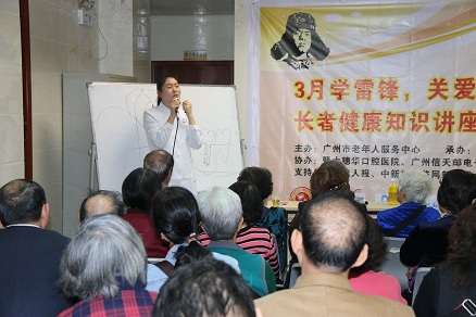 28日下午,越秀区流花街道办事处高贵良书记、街道办杨松道主任专门来到现场,看望了赵广军生命热线协会志愿们和穗华口腔医院的医护人员及150多位参加活动的老人。在健康讲座现场,郝军锋医生就糖尿病、心脑血管疾病、高血压病、骨质疏松等老年人常见病为宣讲内容,介绍了高血压病等的预防、症状、科学用药,以及治疗方法等,从健康生活方式的四大方面即合理膳食、适量运动、戒烟限酒、心理平衡进行了详细讲解,同时引导居民要加强自我保健,防患于未然,提醒长者要保持良好的生活习惯。