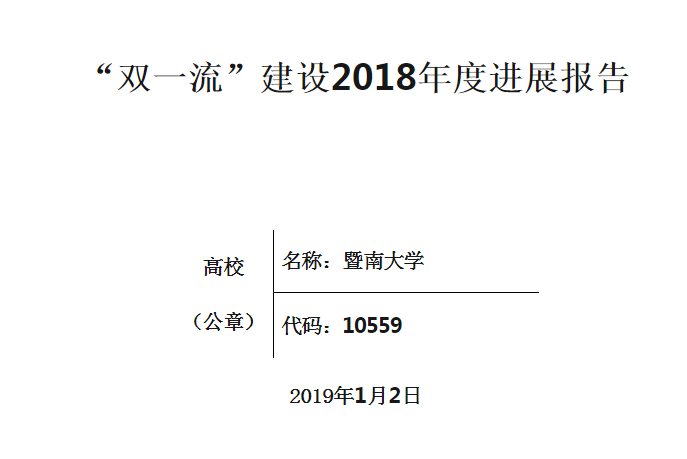 2018年,暨南大学坚持以习近平总书记新时代中国特色社会主义思想为指引,全面贯彻全国教育大会精神和总书记视察暨南大学重要讲话精神,切实落实《教育部 财政部 国家发展改革委印发〈关于高等学校加快“双一流”建设的指导意见〉的通知》(教研〔2018〕5号)相关要求,从人才培养、内涵建设、深化改革等方面全方位推进“双一流”建设,取得了阶段性成果。