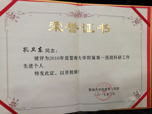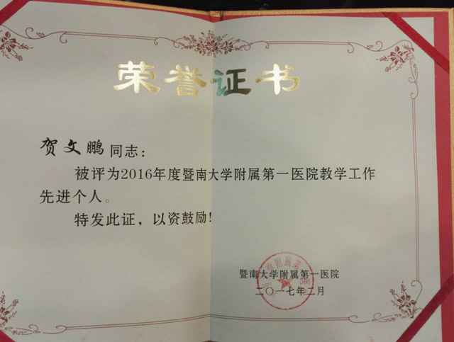 2017年2月17日获悉:穗华口腔正畸科孔卫东主任荣获暨南大学附属第一医院科研工作先进个人,穗华口腔种植科贺文鹏副主任荣获暨南大学附属第一医院教学工作先进个人!