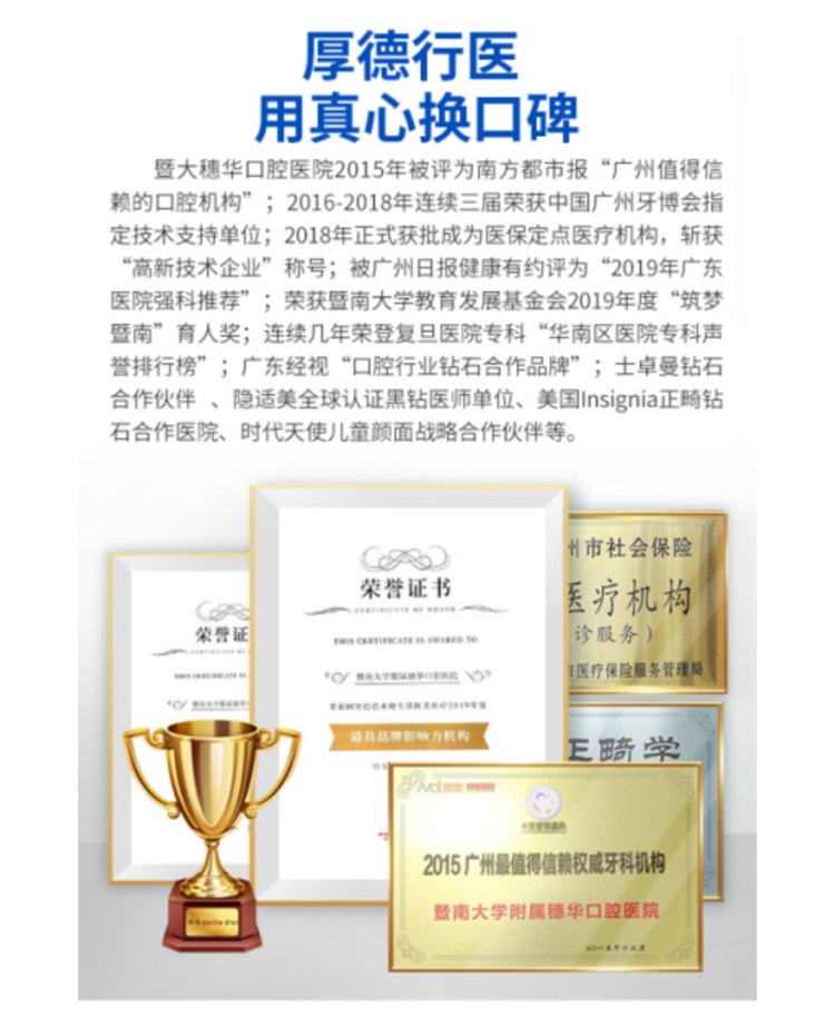 穗华口腔医院作为暨南大学授权合作医院,是依托国内外权威硕博专家医资和口腔医学优势所建立的一所集临床、教学、科研、预防为一体的现代化口腔专科医院,开创了中国医疗改革创新示范的先河。