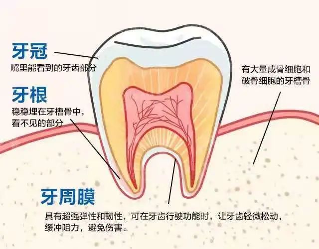 在牙齿和牙槽骨之间还存在着一种物质——牙周膜。牙周膜具有弹性和韧性,使我们的牙齿有一定松动性,可以避免受到伤害,用手指轻轻晃动牙齿就能感觉到它的存在。