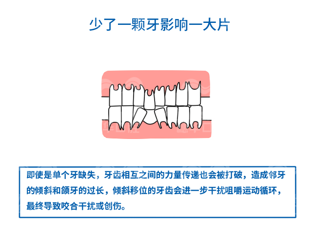 牙齿缺失,会导致邻牙无支撑,往缺牙间隙歪倒,牙齿越长越歪。与缺失牙对应的对颌牙无作用,咀嚼效率下降,“不用则退”,导致压槽骨吸收。邻牙、对颌牙牙根松动,终也落得“脱落”的下场。