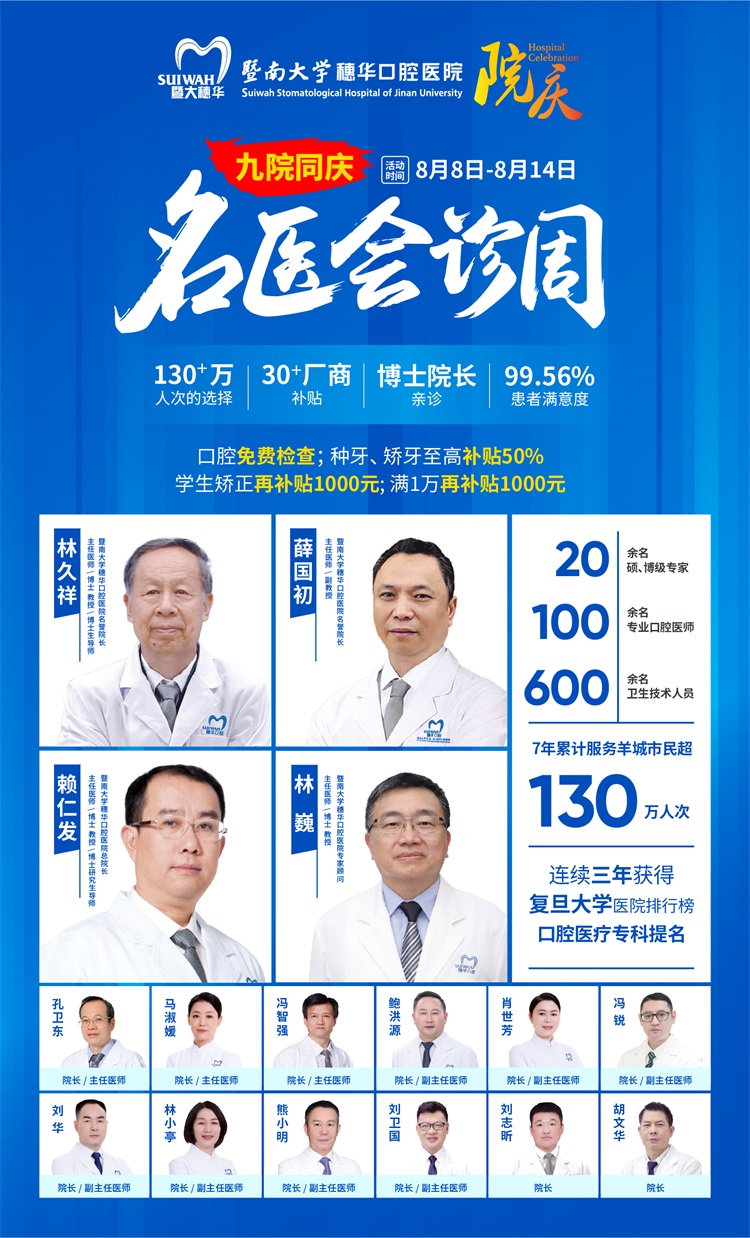穗华口腔医院依托暨南大学一流学科建设及暨南大学口腔医学院的综合优势,齐聚20余名从德、美、日、韩等海外地区留学归国的口腔医学教授、副教授及硕博导师,100余名主任医师、副主任医师及主治医师,400余名名卫生技术人员,还有国际医师常年坐诊,医资实力雄厚、诊疗技术先进,为市民群众口腔健康提供强有力的保障!