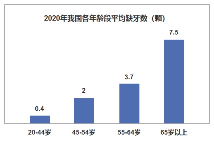 据相关数据统计 截至2020年我国65岁以上人群 平均缺牙数量为7.5颗 该人群86%存在牙缺失 全口无牙比例达4.5% 但治疗率尚未达到20% 缺牙现象随着人口老龄化日趋严重......