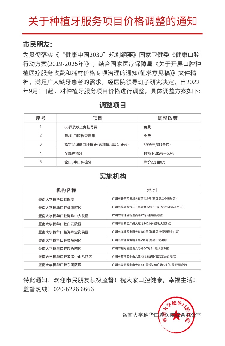 穗华口腔医院是第七届牙博会的唯一指定技术支持医院,多年来以优质诊疗服务、专业诊疗技术、强劲诊疗实力成为华南口腔行业的标杆,备受行业及市民群众的赞誉。穗华口腔医院充分发挥行业带头作用,积极响应国家医保局《关于开展口腔种植医疗服务收费和耗材价格专项治理的通知(征求意见稿)》文件指示精神,并贯彻落实《“健康中国2030”规划纲要》、《健康口腔行动方案(2019年—2025年)》政策方针,9月起针对种植牙价格进行下调。