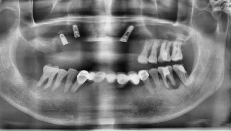 抱着了解的心态咨询种植,吴阿姨便被穗华口腔医院医生周到的服务和专业态度所感染,从口腔全景片和口内实拍图片可以看到,上颌已经没有任何牙齿,余牙松动严重,牙龈因长期戴活动假牙也是萎缩严重。