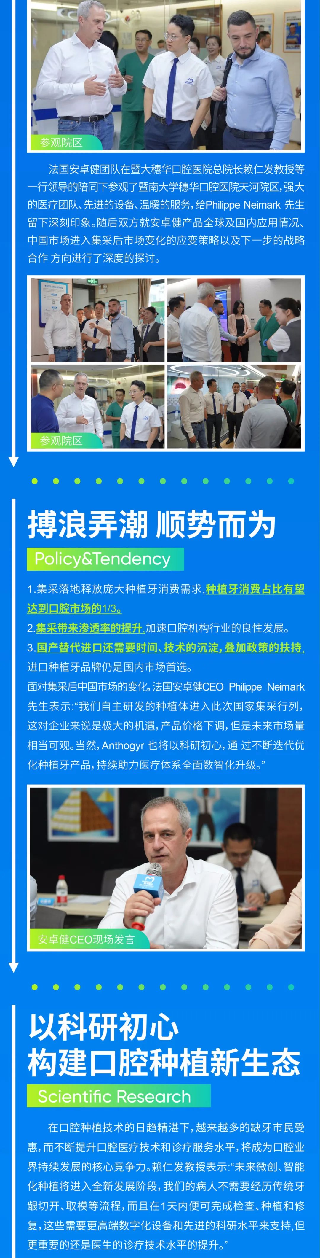 2023年7月25日,法国安卓健CEO Philippe Neimark携领团队莅临参访,穗华口腔医院集团常务副总裁林建平先生与穗华口腔医院总院长赖仁发教授等领导......