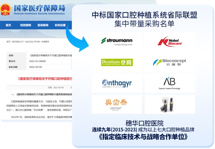 自 2022 年 9 月起,为贯彻落实国家医疗保障局种牙集采政策,切实解决口腔种植领域收费不规范、费用负担重等问题,穗华口腔医院迅速反应,根据集采政策进行全面调整落地,为羊城缺牙市民提供高质量、高效率、能负担的缺牙修复服务。
