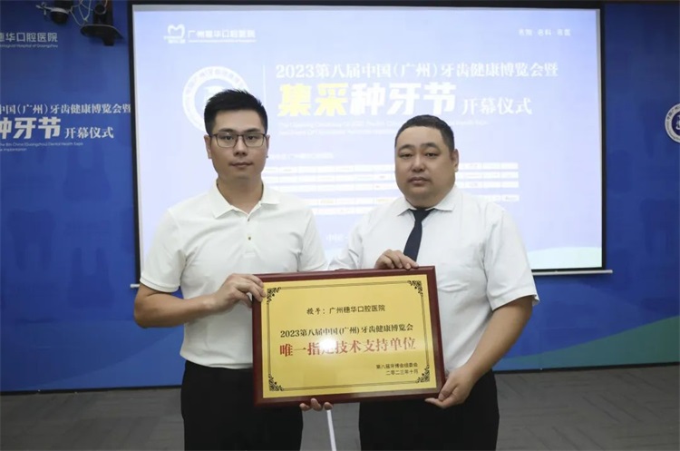 ▲牙博会组委会代表康国宝先生授予广州穗华口腔医院“牙博会唯一指定技术支持单位”牌匾