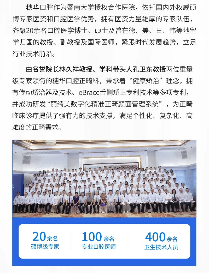 穗华口腔医院作为暨南大学授权合作医院,是依托国内外权威硕博专家医资和口腔医学优势所建立的一所集临床、教学、科研、预防为一体的现代化口腔专科医院,开创了中国医疗改革创新示范的先河。