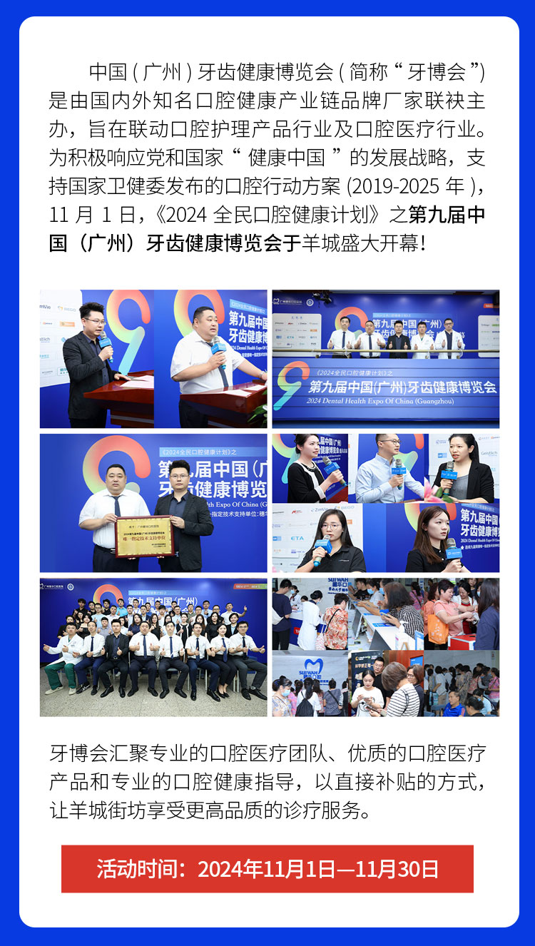 《2024全民口腔健康计划》之第九届中国(广州)牙齿健康博览会,由国内外知名口腔健康产业链品牌厂家联袂主办,活动时间:2024年11月1日-11月30日......