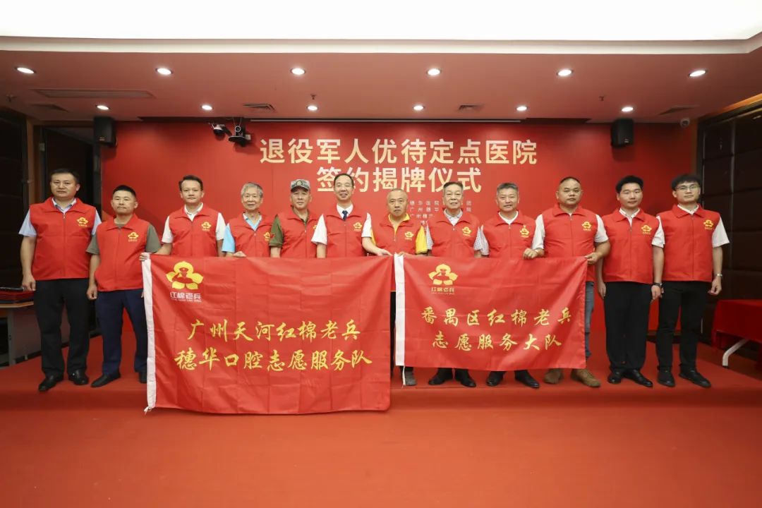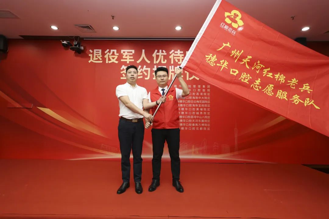 本次穗华医院管理集团旗下十一家口腔专科连锁医院集体共建为退役军人优待定点医院,并接受红棉老兵穗华口腔志愿服务队授旗,组建穗华口腔志愿服务队,彰显了新时代民营医院在爱国拥军方面的责任与担当。
