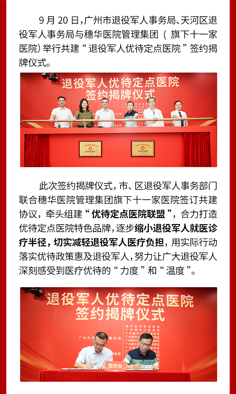 9 月 20 日,广州市退役军人事务局、天河区退役军人事务局与穗华医院管理集团(旗下十一家医院)举行共建“退役军人优待定点医院”签约揭牌仪式。......