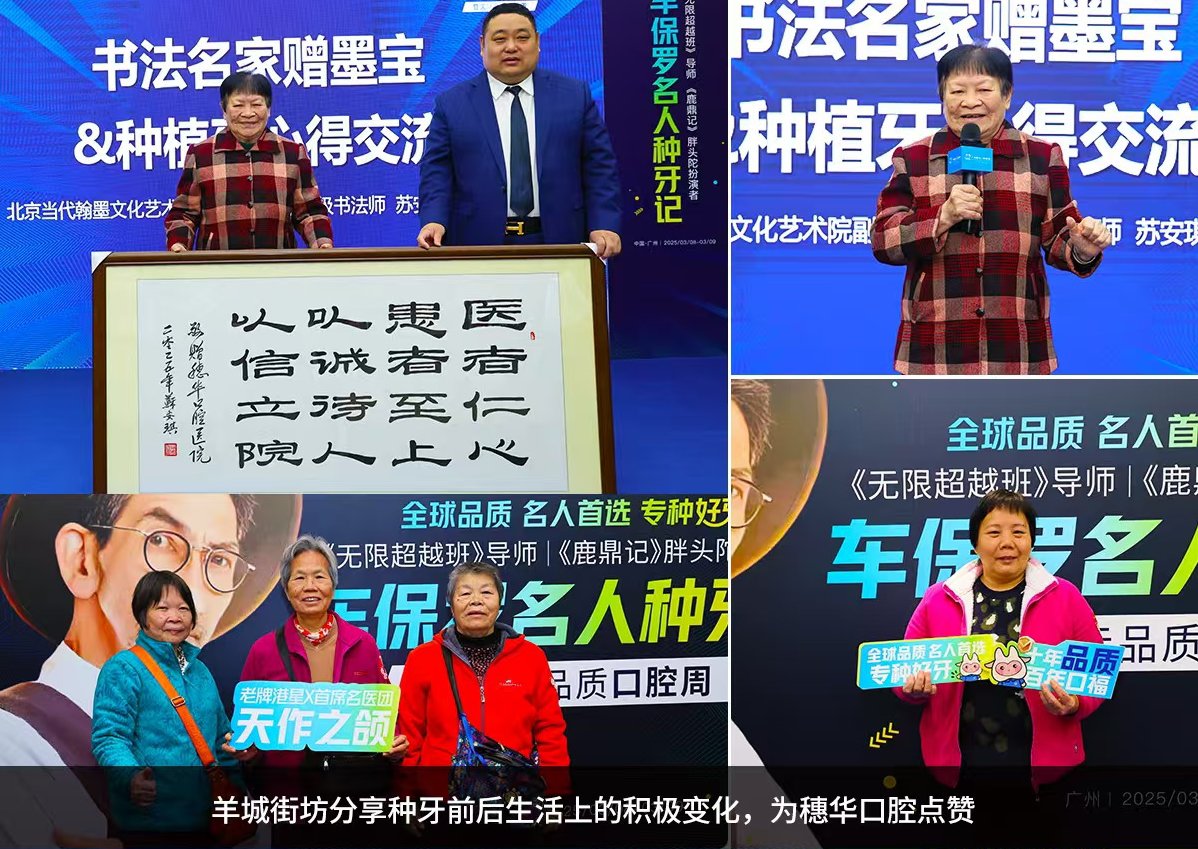 活动中,多名名人、种牙老顾客纷纷现身说法,与在座的街坊们分享了他们在穗华口腔的诊疗体验。他们详细讲述了从初诊咨询到术后恢复的全过程,对穗华口腔的专家团队、先进技术和贴心服务赞不绝口。其中,北京当代翰墨文化艺术院副院长、国家一级书法师苏安琪老师也亲临现场,不仅分享了自己在穗华口腔的种牙体验,更是挥毫泼墨,为穗华口腔亲笔题字,点赞穗华口腔的实力与口碑。