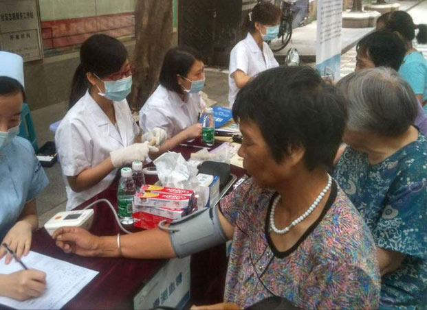 医护人员为老人检查身体
