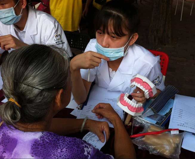 医疗人员为大妈讲解牙齿知识