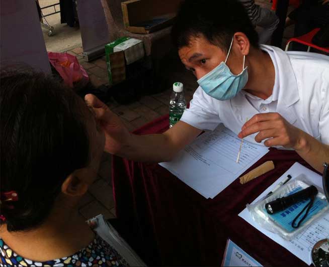 医疗人员给大妈检查牙齿(版权归穗华口腔医院所有,如需转载请注明文章来源:穗华口腔医院 http://www.62266666.com)