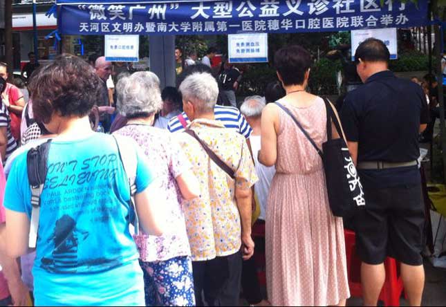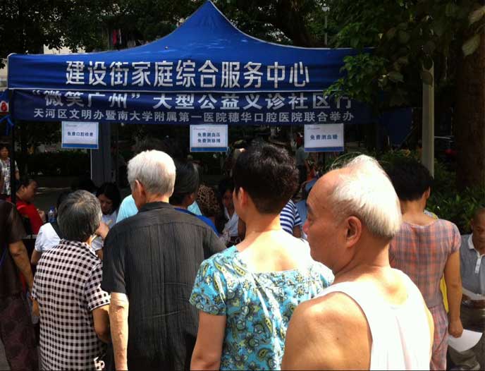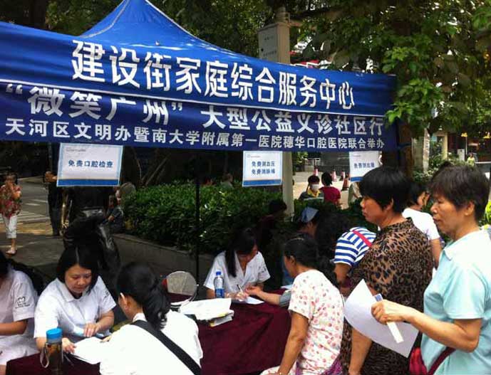 2015年7月18日,穗华口腔医院公益医疗队伍来到建设文化广场,为当地的居民带来一场公益义诊,免费为居民检查口腔、测量血压脉搏血糖等。
