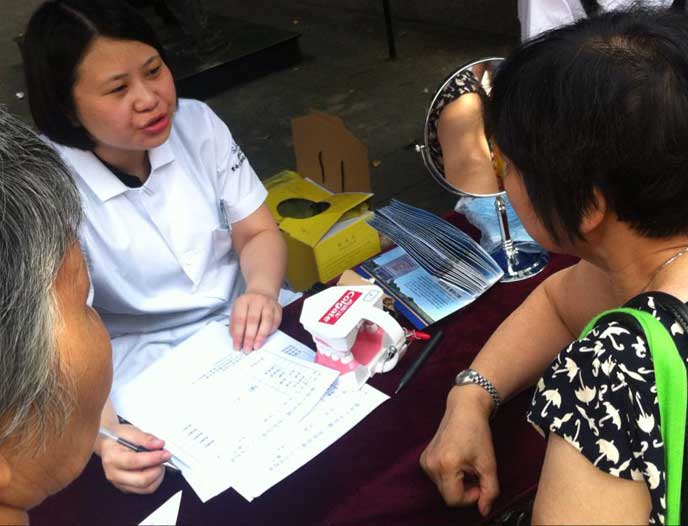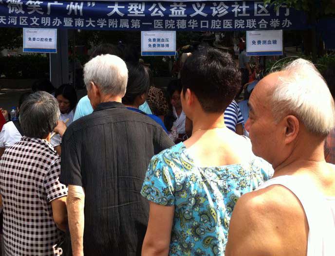 义诊现场,居民们依序排好队,接受穗华口腔的医疗人员检查口腔、测量血压脉搏血糖并且咨询口腔问题。居民们纷纷表示这是个难得的了解自己口腔健康和身体健康的机会,并让他们认识到之前不晓得的口腔保健方面的重要性,对这种义诊活动非常感兴趣。