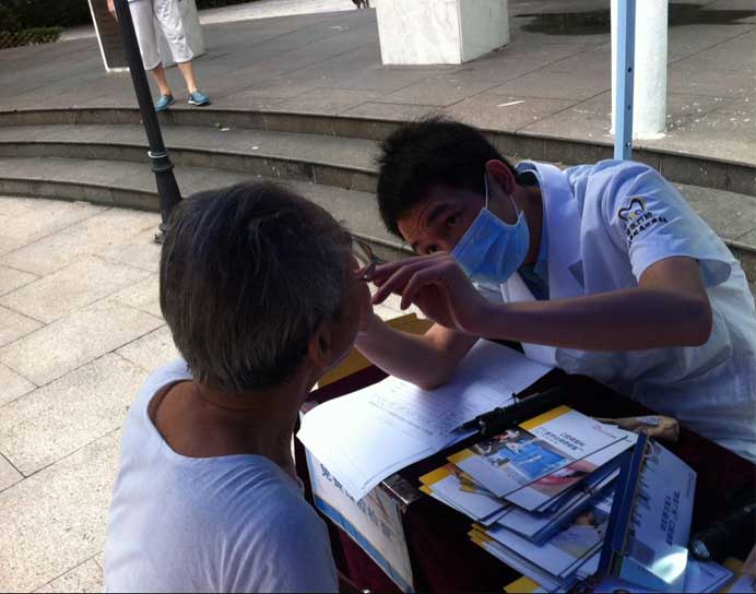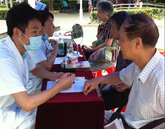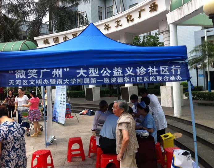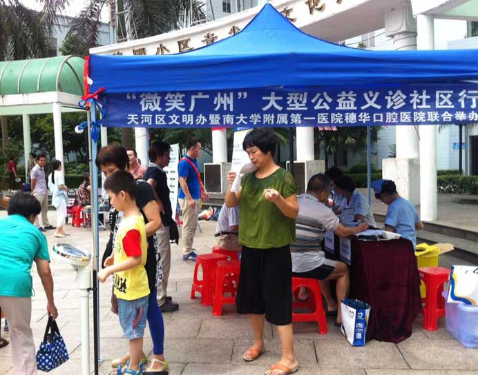2015年7月23日,穗华口腔医院公益医疗队伍来到穗园小区,开展一场“微笑广州”大型公益义诊活动,为当地居民免费检查牙齿、测量血糖血压、口腔咨询等。