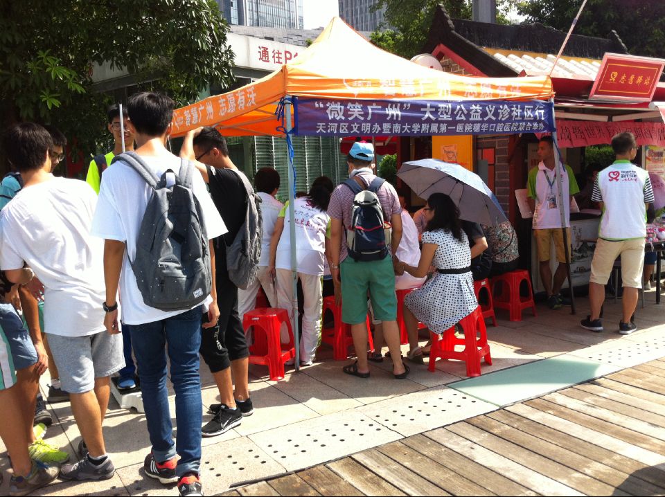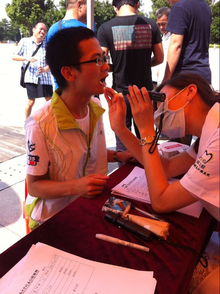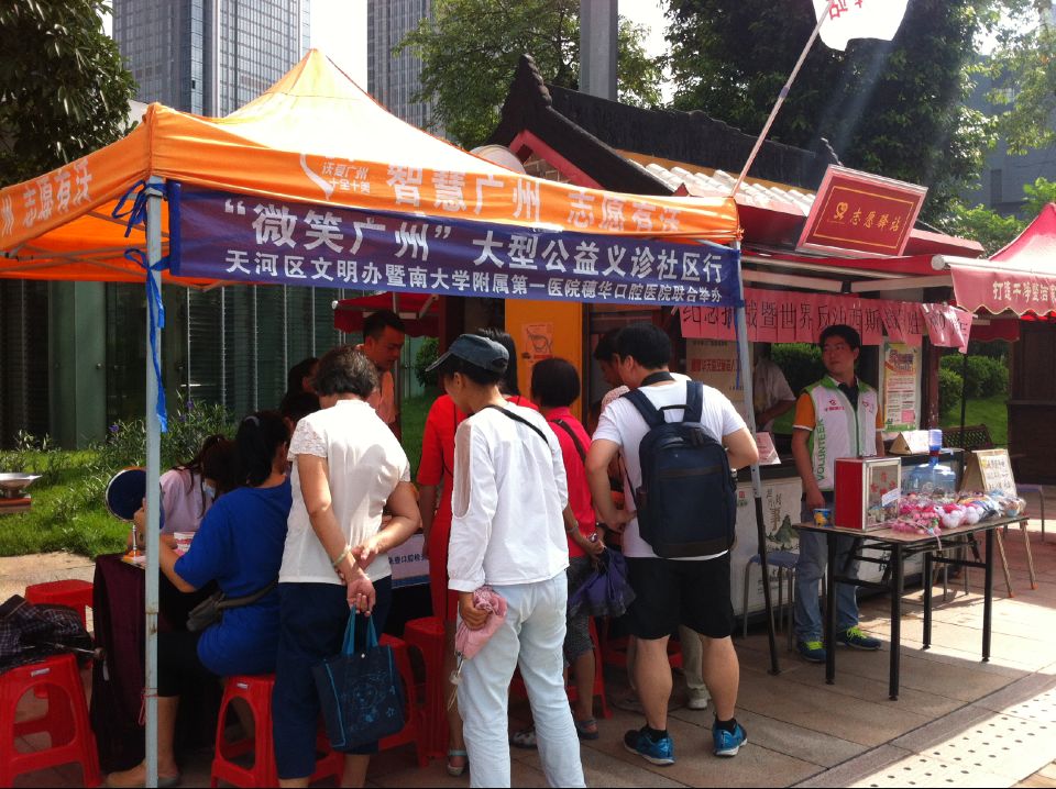 广州 “花城广场”,位于黄埔大道 以南、华夏路以东、冼村路 以西、临江大道以北,广场宽处250米,总面积约56万平方米,是人民公园面积的8至10倍。这里人流量充足,穗华口腔医疗队伍来到这里开展义诊活动,大大满足了这里的人们对口腔健康的需求,人们纷纷上前让医生检查牙齿,咨询口腔问题,以了解自己的口腔状况,体现出现代人们对牙齿的关爱,牙齿好才能吃得香,牙齿好才能保证身体健康。