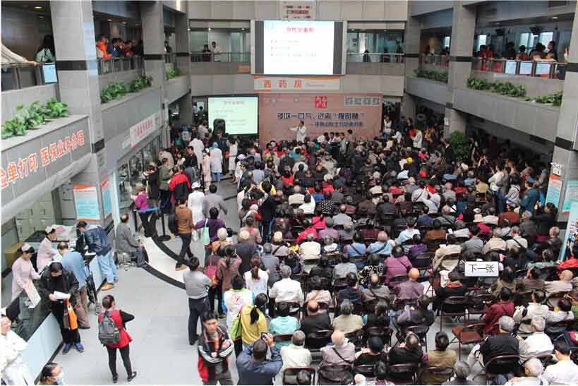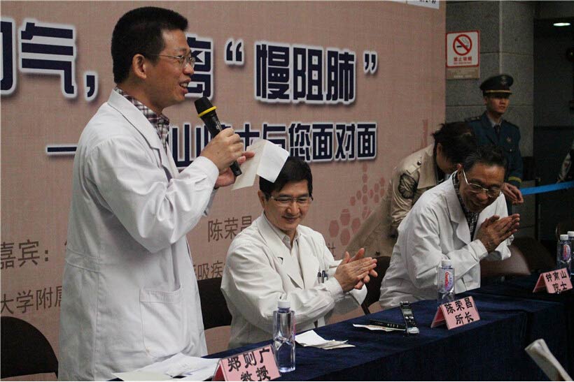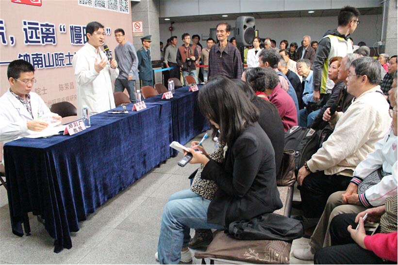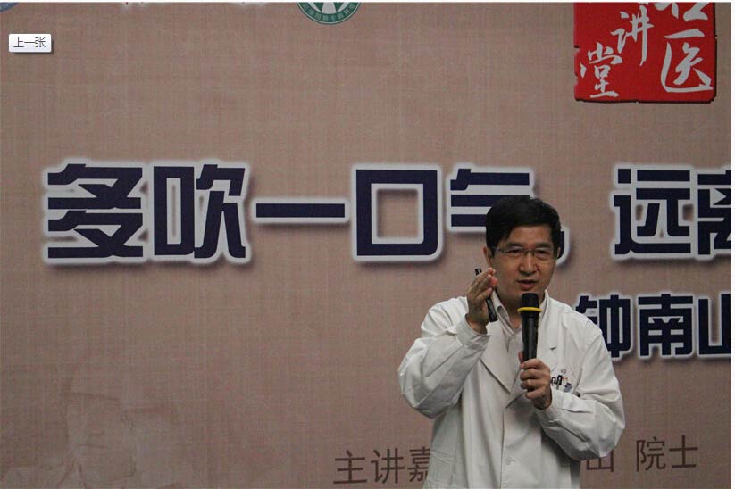 图为钟院士在名医大讲堂上正在对慢阻肺进行宣传教育的讲座,现场座无虚席。