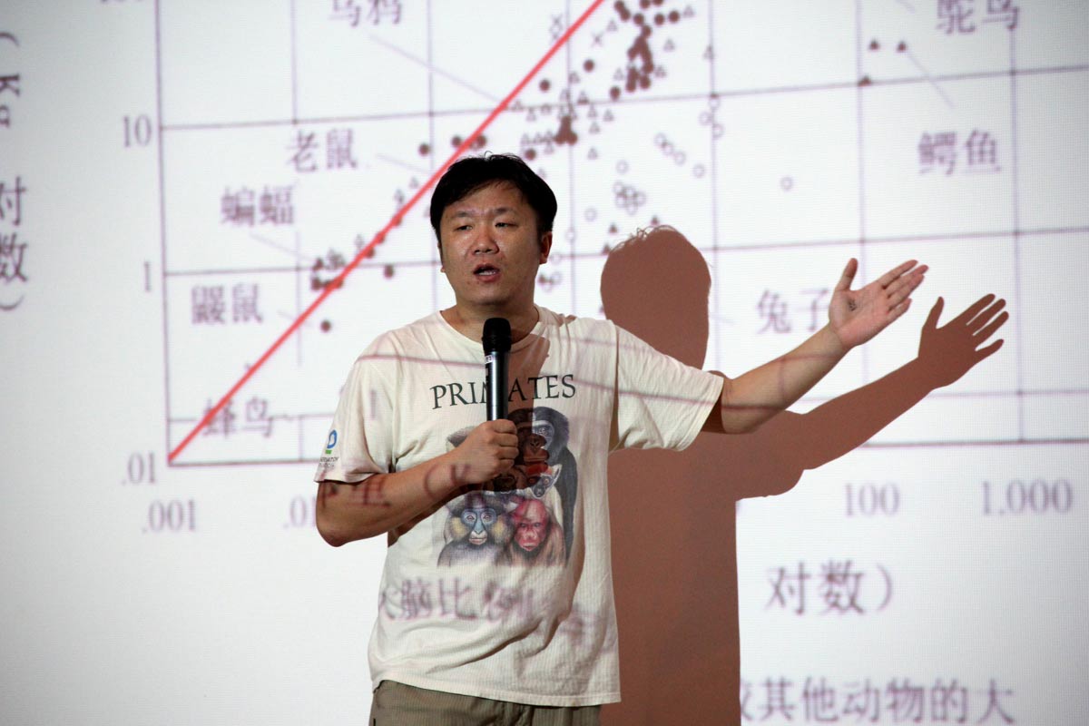 当谈起人类与猿猴的区别时,张鹏对大家普遍认为的“脑容量大小、能否使用工具、形成文化”这几个方面进行了详细的阐述,并援引自己十余年的研究生涯中的例证,说明了这些都不是人类与猿猴的本质区别。例证中不乏猿猴们“合作越狱”、“洗红薯”、“泡温泉”等趣闻,让看似呆板枯燥的研究成为了欢乐的时光,也让同学们见识到了猿猴“丰富多彩的生活”。回归问题本身,他认为,“形成家庭、能直立行走、形成语言”才是人类与猿猴本质的区别。
