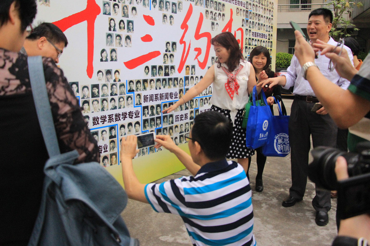 站在中文系汉语专业的展板前,黄震平指着一张瘦小黝黑的照片说:“这就是我,变化很大。”除了看自己专业的同学,黄震平也仔细看其他班熟悉的面庞。“这个是我中学同学,这个也是我中学同学,大学的时候读外语系。”他指着另外两张照片说。