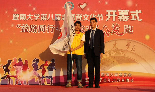 11月26日,暨南大学第八届志愿者文化节开幕式在南校区运动场举行。学校党委副书记、副校长叶勤宣布开幕并为新成立的志愿服务队授旗出席。