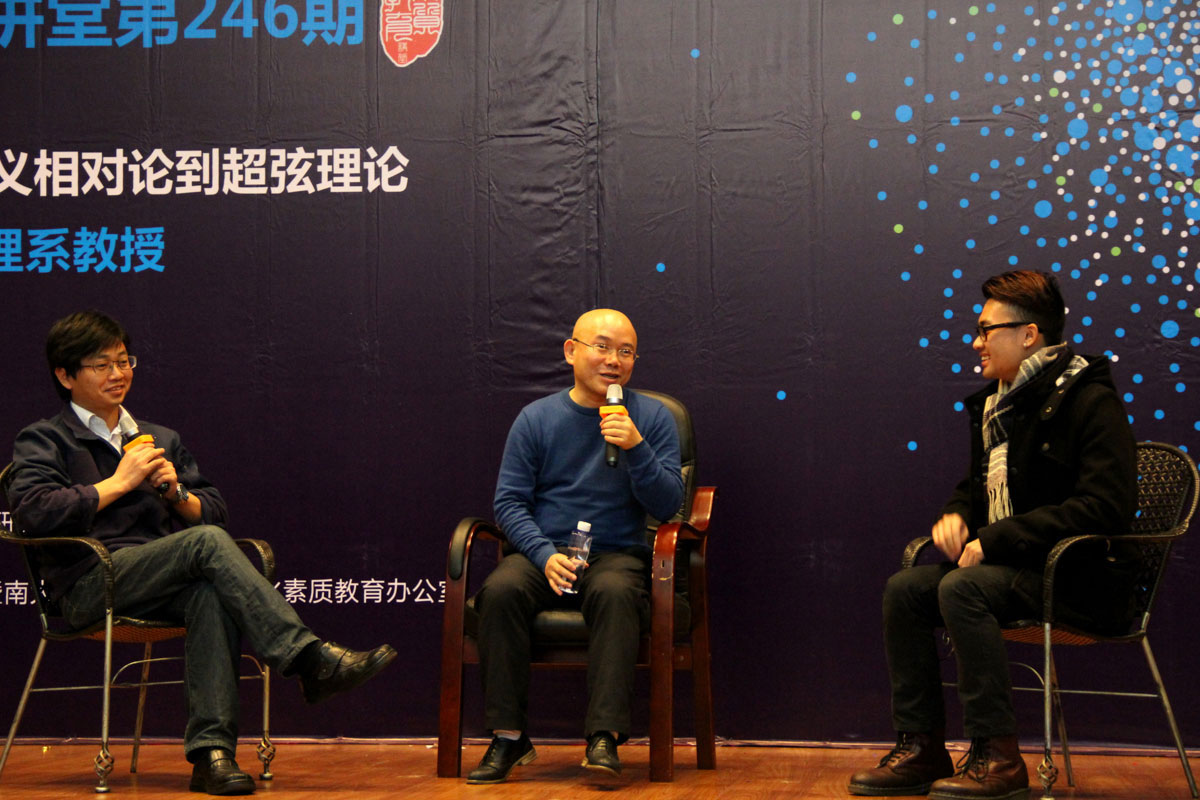 在讲解部分结束后,理工学院副教授徐繁荣、大四学生王洺贤与朱传界进行了现场座谈。王洺贤向朱传界提出了“超弦理论应如何证明”和“学生做物理学研究应如何提高自己的数学能力”两个问题,徐繁荣就“当前物理实验装置的发展会对理论研究起到何等贡献”这一热点与朱传界进行了探讨。朱传界一一作出了详尽的解答。