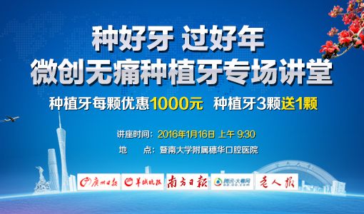 为响应广州市天河文明办“微笑广州·大型口腔健康公益”活动,穗华口腔医院将联合广州日报、南方日报等媒体举办主题为“种好牙 过好年”微创无痛种植牙专场讲堂,穗华微创无痛种植专家讲堂将邀请资深种植科专家讲解微创无痛种植牙的奥秘,同时享种植牙公益援助优惠,让您能种口好牙过个其乐融融的好年。