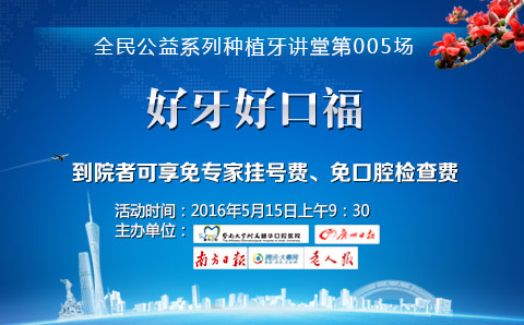 2016年5月15日上午9:30,全民公益系列种植牙讲堂第005场将邀请穗华口腔医院种植科主任冯智强为广大缺牙者解疑释惑,让缺牙者更深入地了解种植牙,拥有好牙好口福。