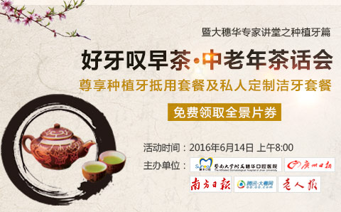 2016年6月14日上午8:00,好牙叹早茶?中老年茶话会将邀请穗华口腔医院院长赖仁发为广大读者解疑释惑,还有已做种植牙的患者现场为大家分享交流种植牙的使用效果及种牙过程的心得体会。