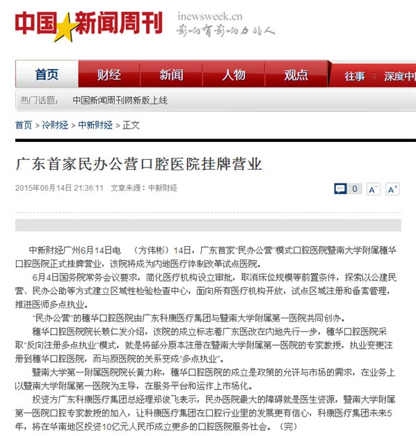 《中国新闻周刊》报道中国民办公营口腔医院挂牌营业