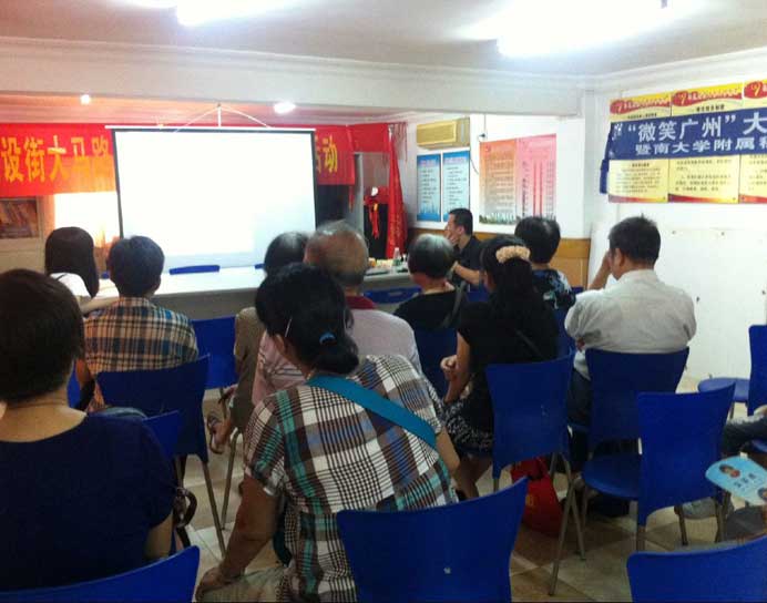 2015年7月17日,穗华口腔医院公益医疗队伍来到建设大马路社区进行讲座,为居民详细讲解关于口腔方面的知识,免费检查牙齿和咨询口腔知识,帮助居民了解牙齿护理的重要性,提高居民牙齿保健的意识。