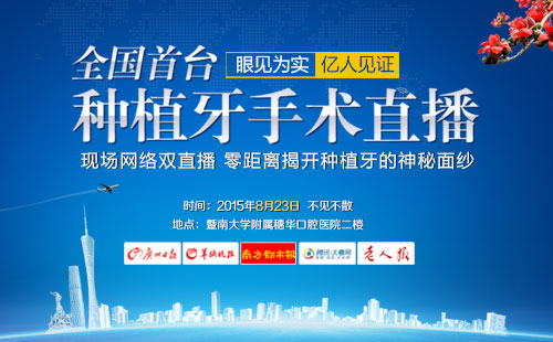 8月23日上午9:30,全国首台现场网络双直播3D靶向种植牙手术将在穗华口腔医院进行!现场观众报名现在开放!穗华口腔医院主任医师冯智强将全程解说手术过程,......