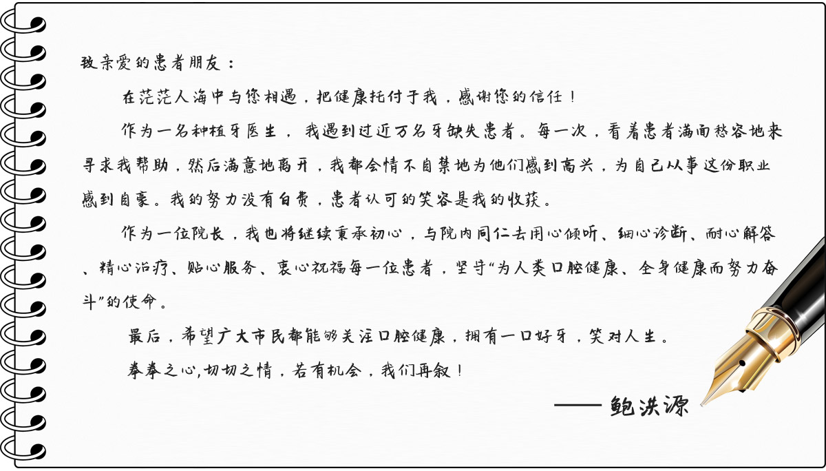 鲍洪源院长自从事口腔临床工作以来,一直有自己的从医理念:他认为作为种植牙医师,不仅要对种植技术深入研究,还要有过硬的医技,更要从患者的切身需求出发,感谢市民一直以来对我们医疗工作的配合、支持与信赖。