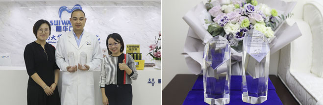 2018年11月6日,穗华口腔荔湾院区张涛医生获隐适美杰出贡献奖,来自美国隐适美公司驻广州办事处的负责人特为其颁奖。